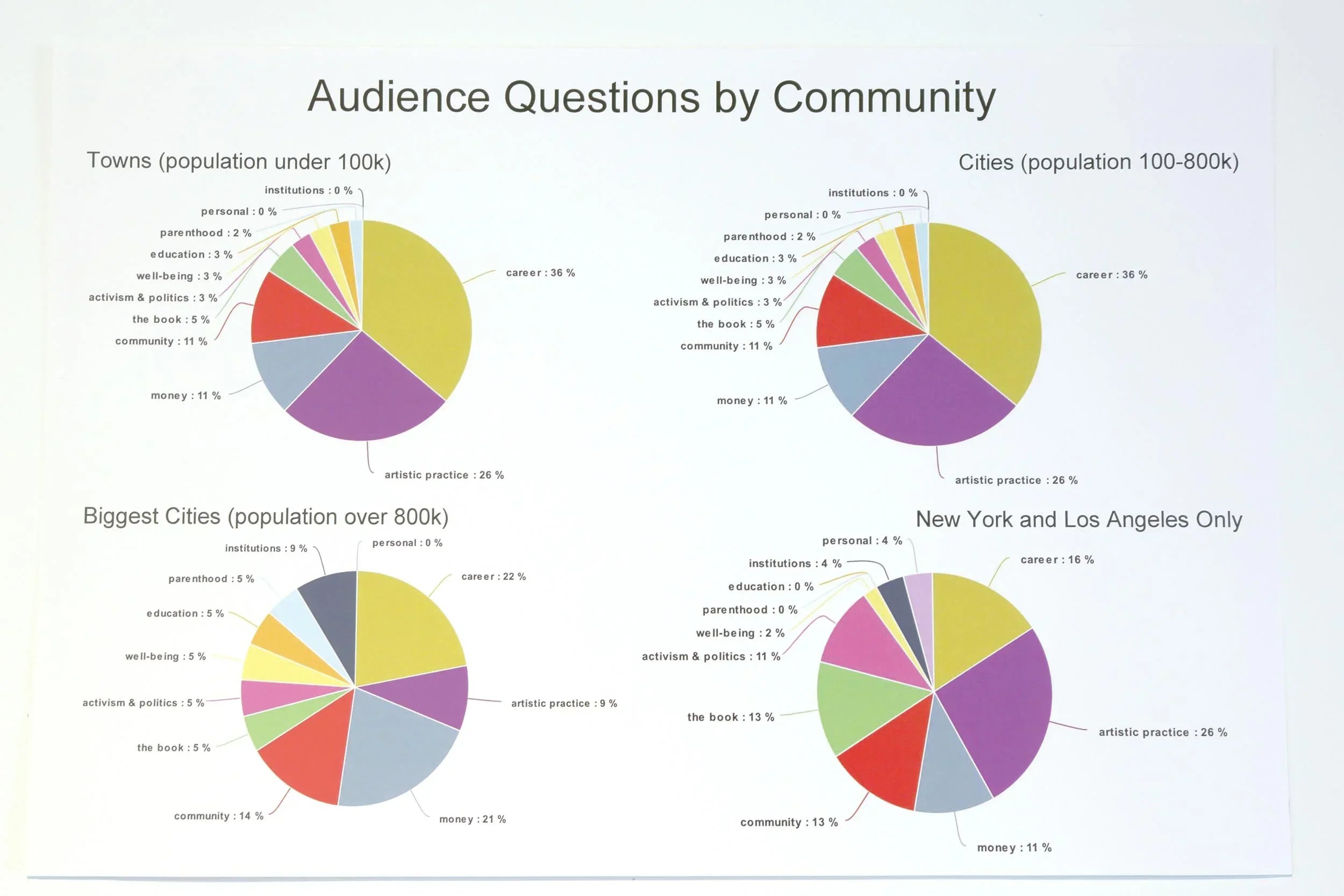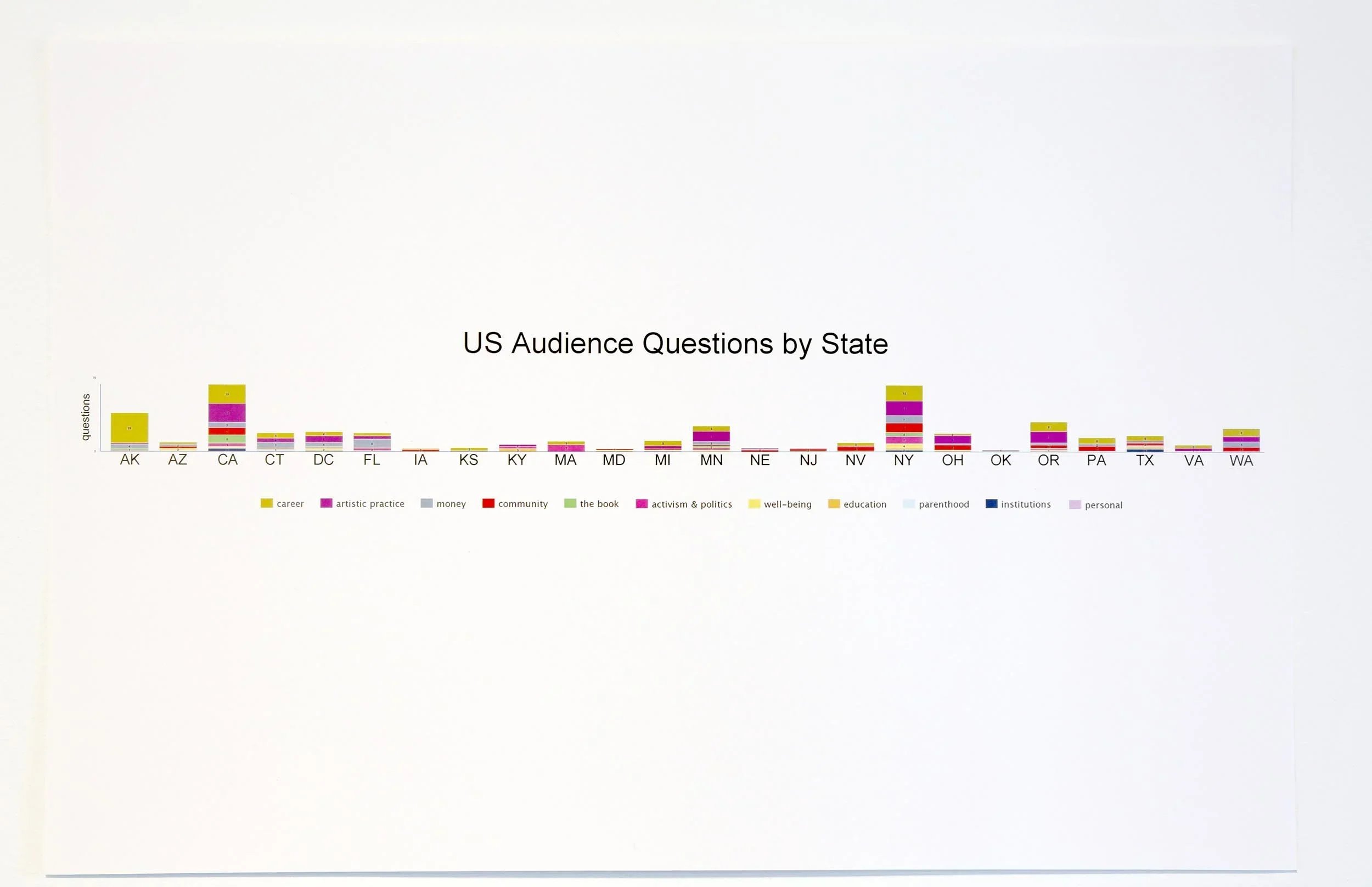 This treasure trove of data was culled from every question asked by audience members at each one of the 82 video-recorded panel discussions, symposia, and town-hall forums on the tour. The formal & informal information, data, and statistics from this study were visualized in the exhibition and has been shared with foundations, arts organizations, academic institutions, and other think tanks which are working for the betterment of artists and the important role they play in our lives.